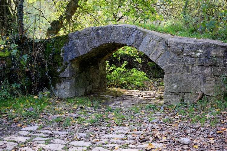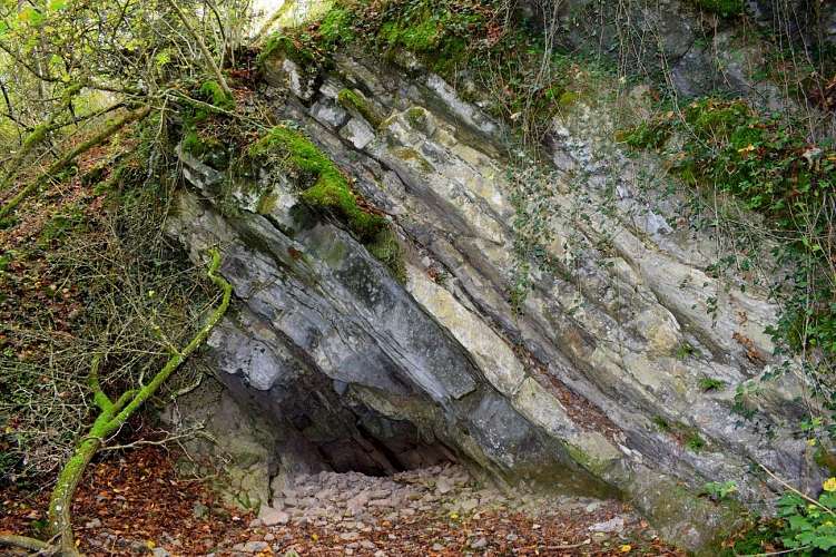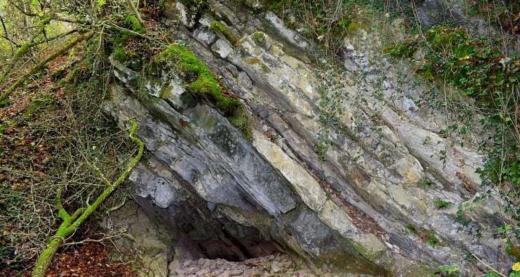 Petit détour avant de continuer votre chemin au repère spéléo : La résurgence de l’Isbelle. Vous pouvez admirer l’entrée de cette résurgence, seulement accessible aux plongeurs. Elle permet de reconnaitre une rivière souterraine dont la plus grande partie est toujours inconnue par l’homme. Cette résurgence est alimentée par des pertes situées plus haut dans la vallée. A l’étiage, cette résurgence ne coule plus, par fortes précipitations le cours aérien de l’Isbelle redevient actif.