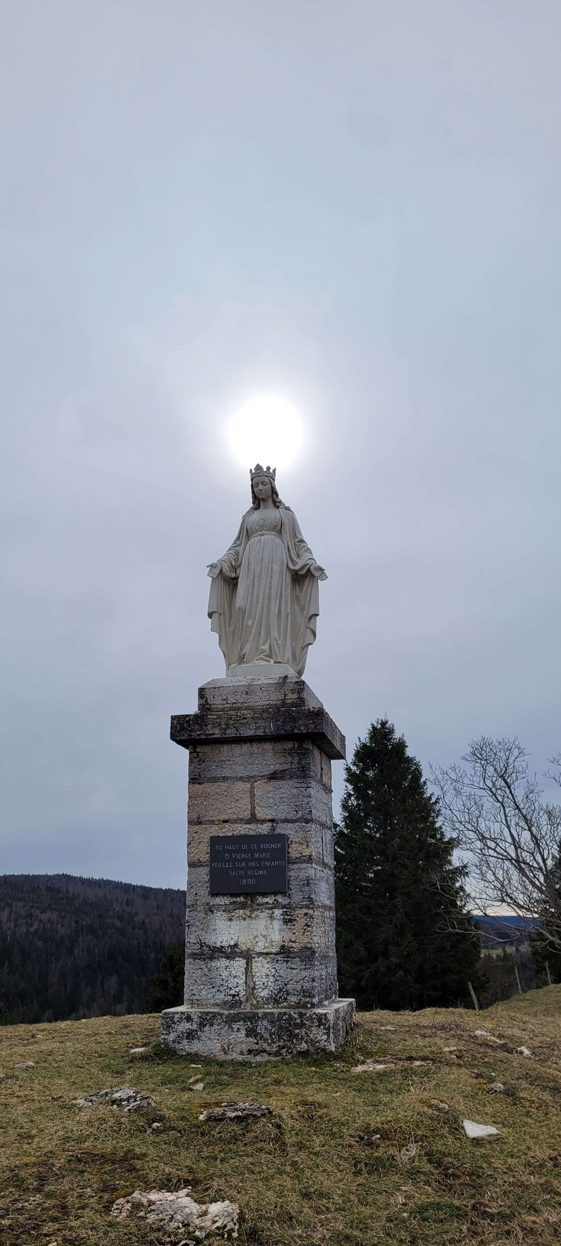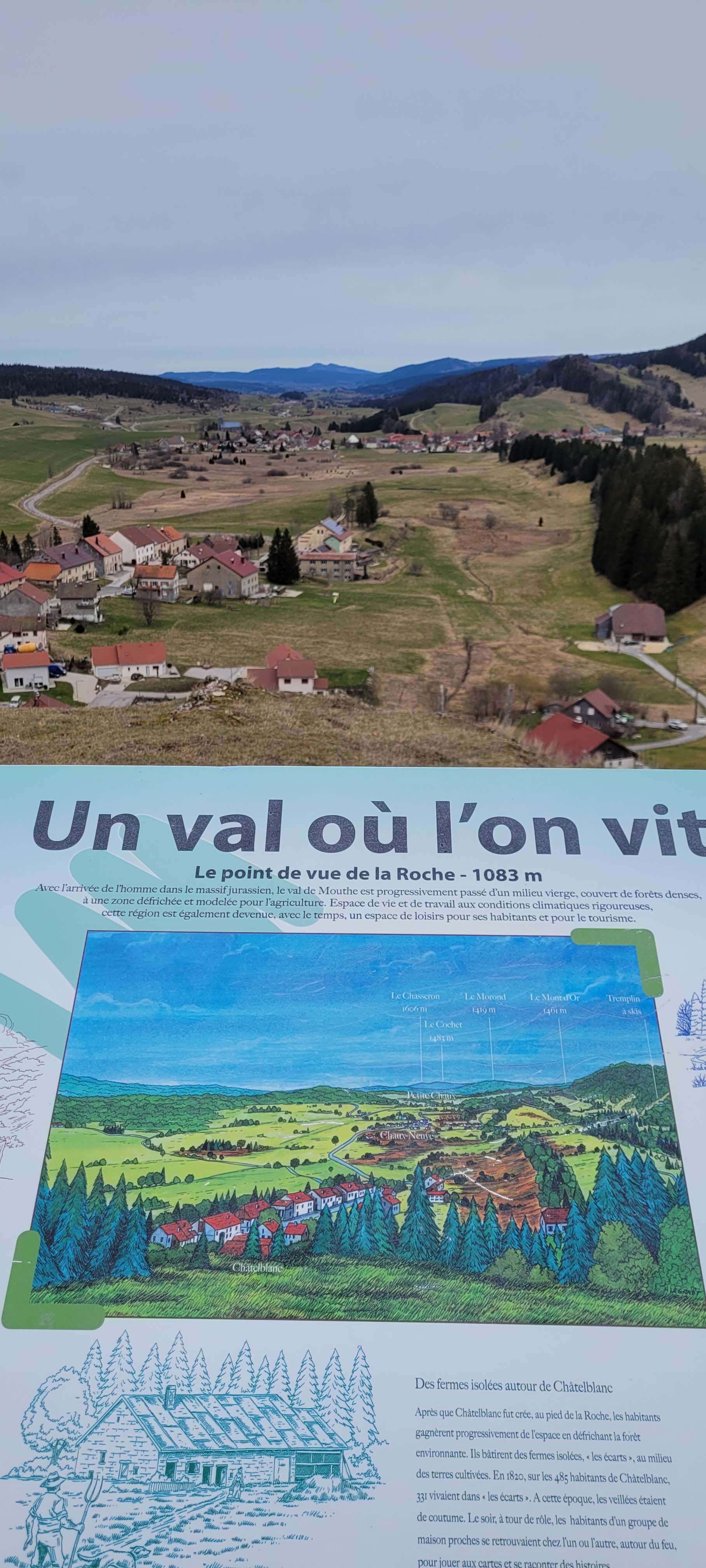 Boucle qui vous fera découvrir le point de vue de la Roche Blanche avec sa Vierge. Panorama à 360°, à l'Est vue sur Châtelblanc et le Val de Mouthe; à l'Ouest vue sur le Val de Foncine ; au Sud l'immense forêt du Noirmont et au Nord vue sur les Cabouilles, la Combette, la Vernouge et le Mont Croz. Puis la cascade du Bief Bridaux par un sentier très étroit (il faudra être vigilant) , et le haut du tremplin de Chaux-Neuve par de beaux sentier. Retour en forêt.